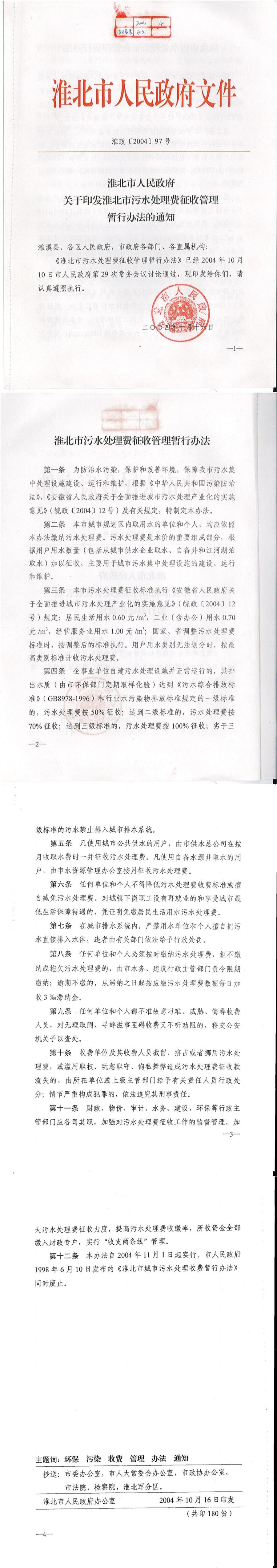 淮北市人民政府關(guān)于印發(fā)淮北市污水處理費征收管理暫行辦法的通知 淮政【2004】97號