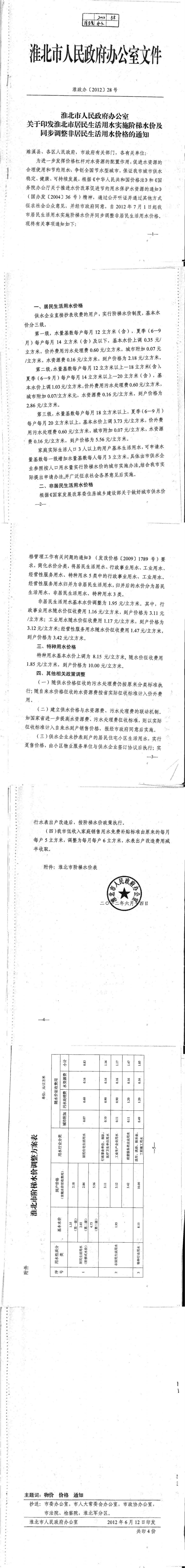 淮北市人民政府關于印發淮北市居民生活用水實施階梯水價及同步調整非居民生活用水價格的通知 淮政辦【2012】28號