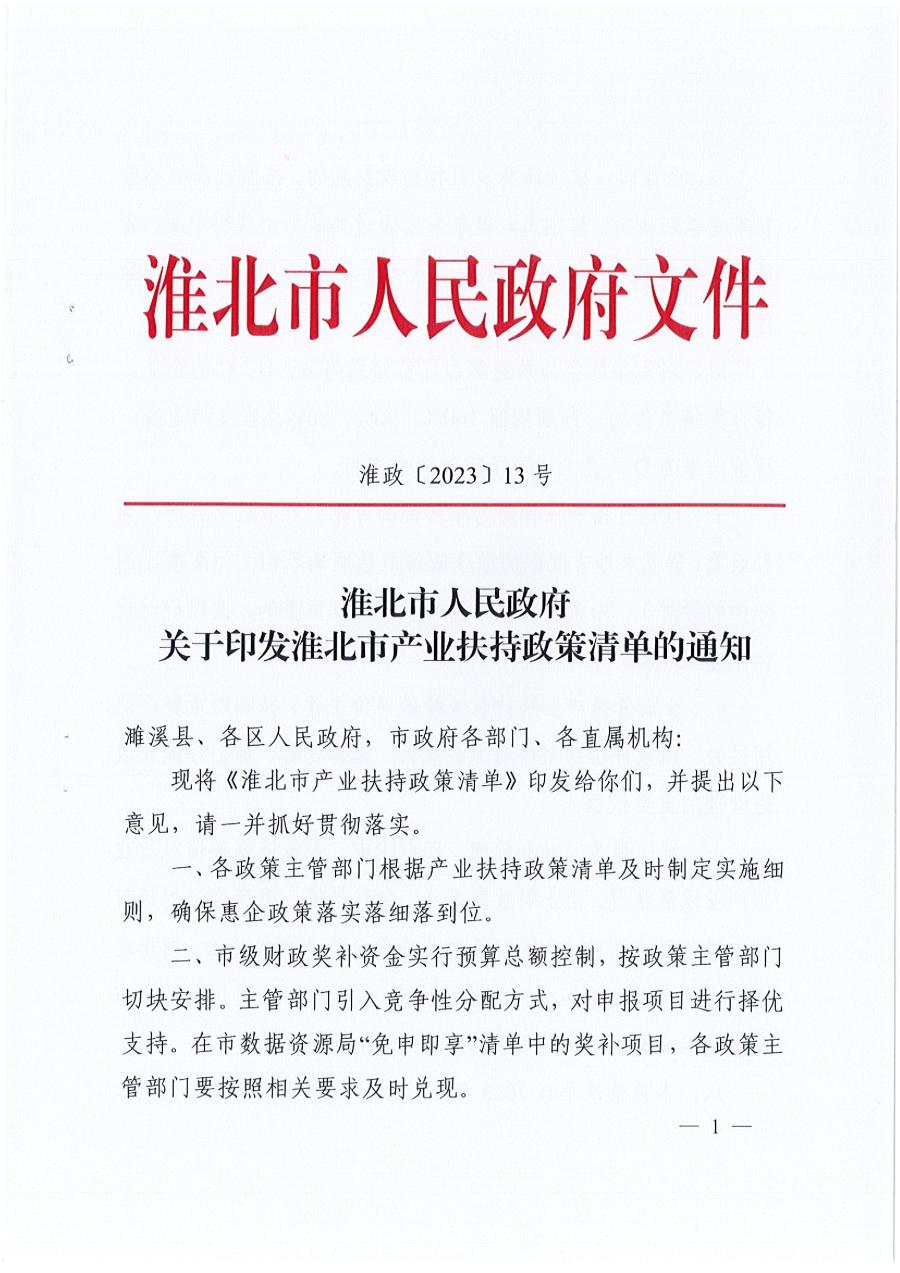 淮北市人民政府關于印發淮北市產業扶持政策清單的通知 淮政【2023】13號