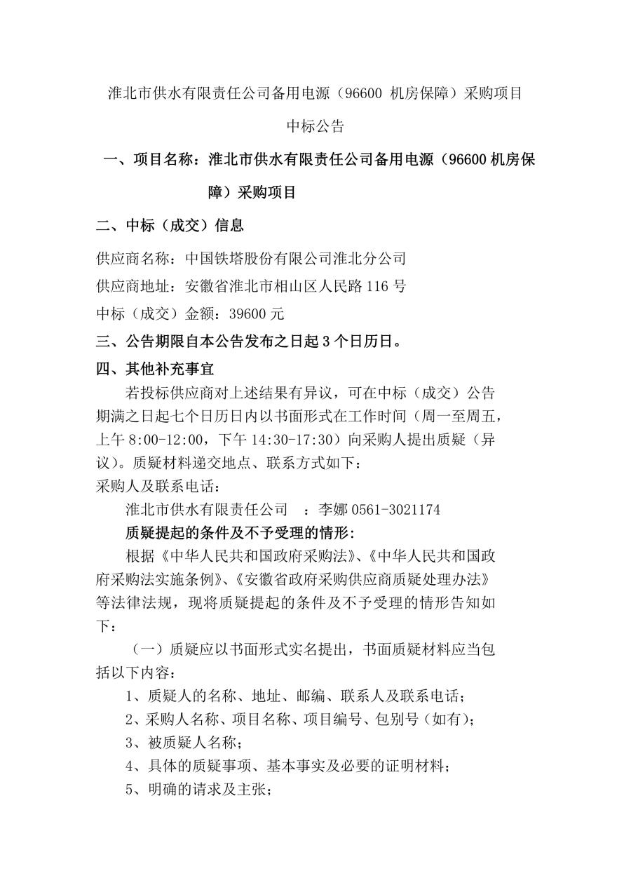備用電源采購中標公告